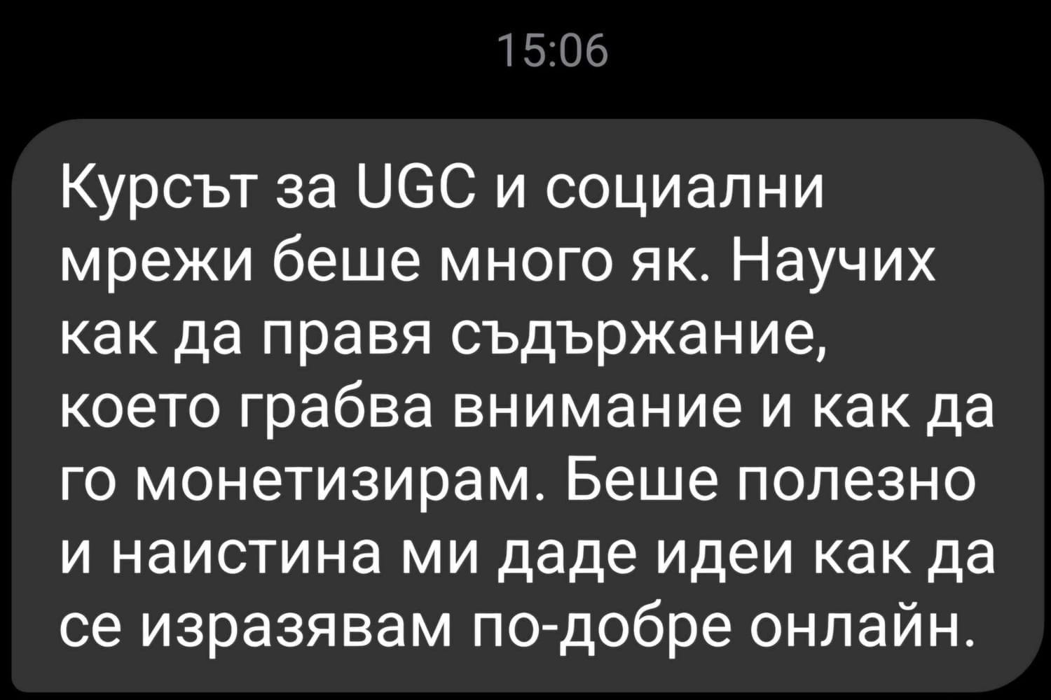 Това е онлайн курс, който те учи как да създаваш ангажиращо UGC (User-Generated Content) съдържание за брандове и социални мрежи. Включва практически задачи, AI инструменти за по-лесно създаване на съдържание и стратегии за растеж в социалните мрежи. След всеки модул има тест, който трябва да преминете.
