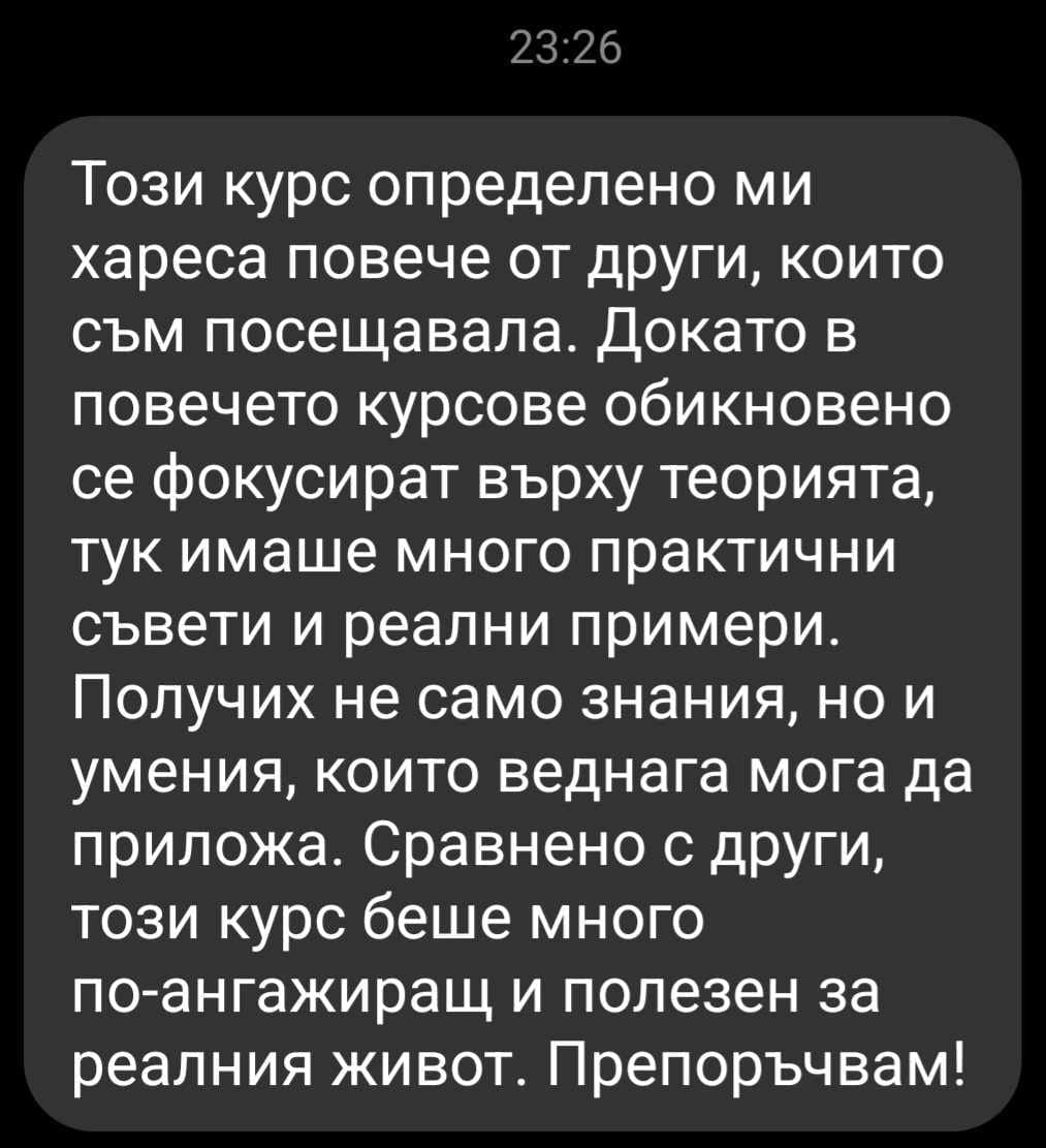 1. Комбинация от теория + практически задачи с обратна връзка - участниците в Standard и Platinum пакетите получават лична обратна връзка за своите задачи, което ускорява прогреса им.